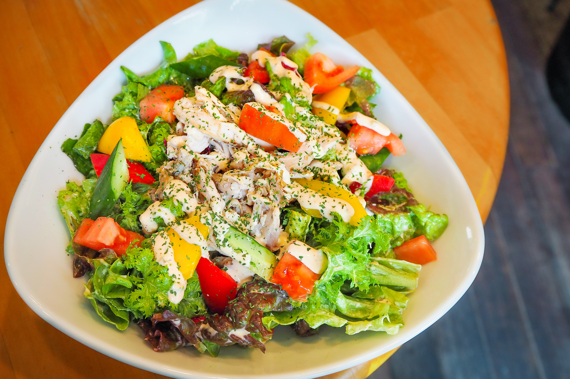 チキン・ゆで卵・アボカド・パプリカ・きゅうり・ミニトマト・レタス・コブサラダドレッシング